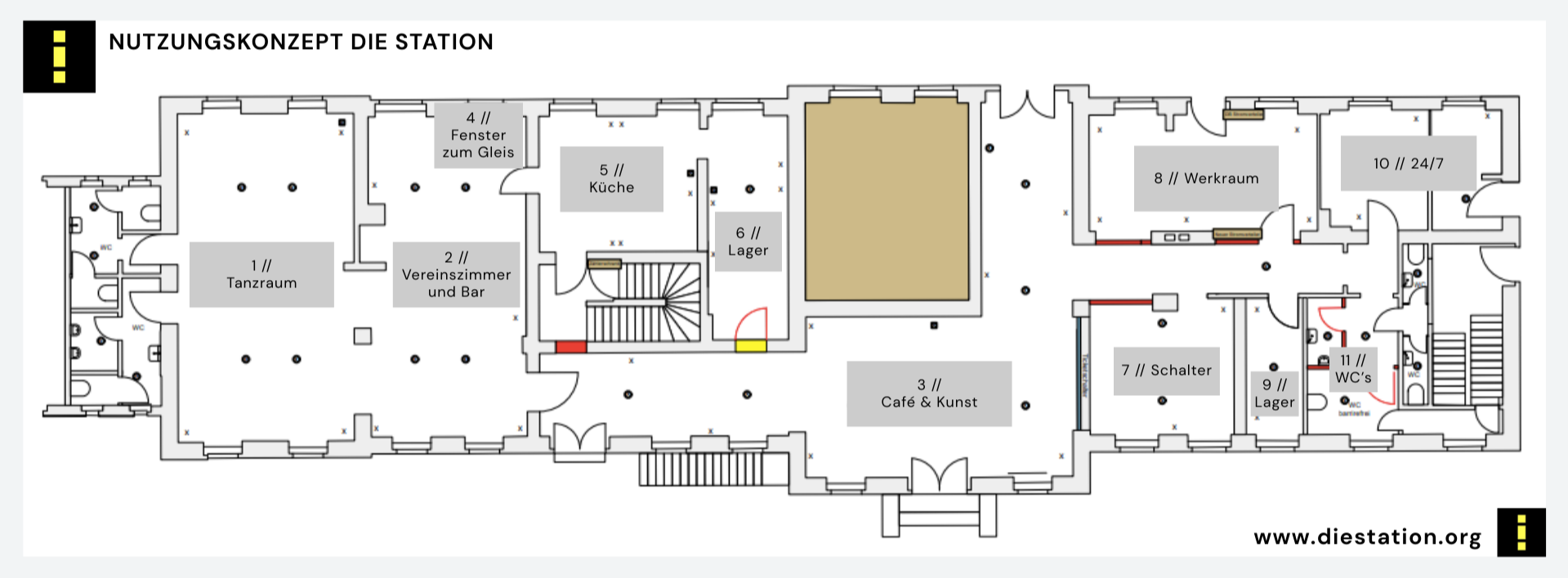 (bisher Bahnhofshalle): Café mit kleinem Gastro-Angebot, Öffnungszeiten vor allem tagsüber, punktuelle Abendveranstaltungen im Kulturbereich wie z.B. Vernissagen, Lesungen, Konzerte oder ähnliches